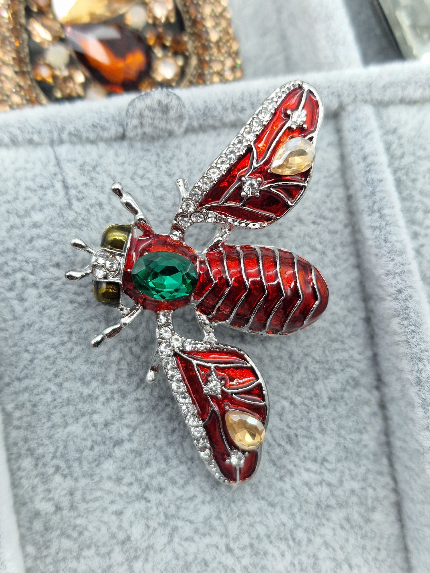 Brož moucha včela červená zdobená kamínky