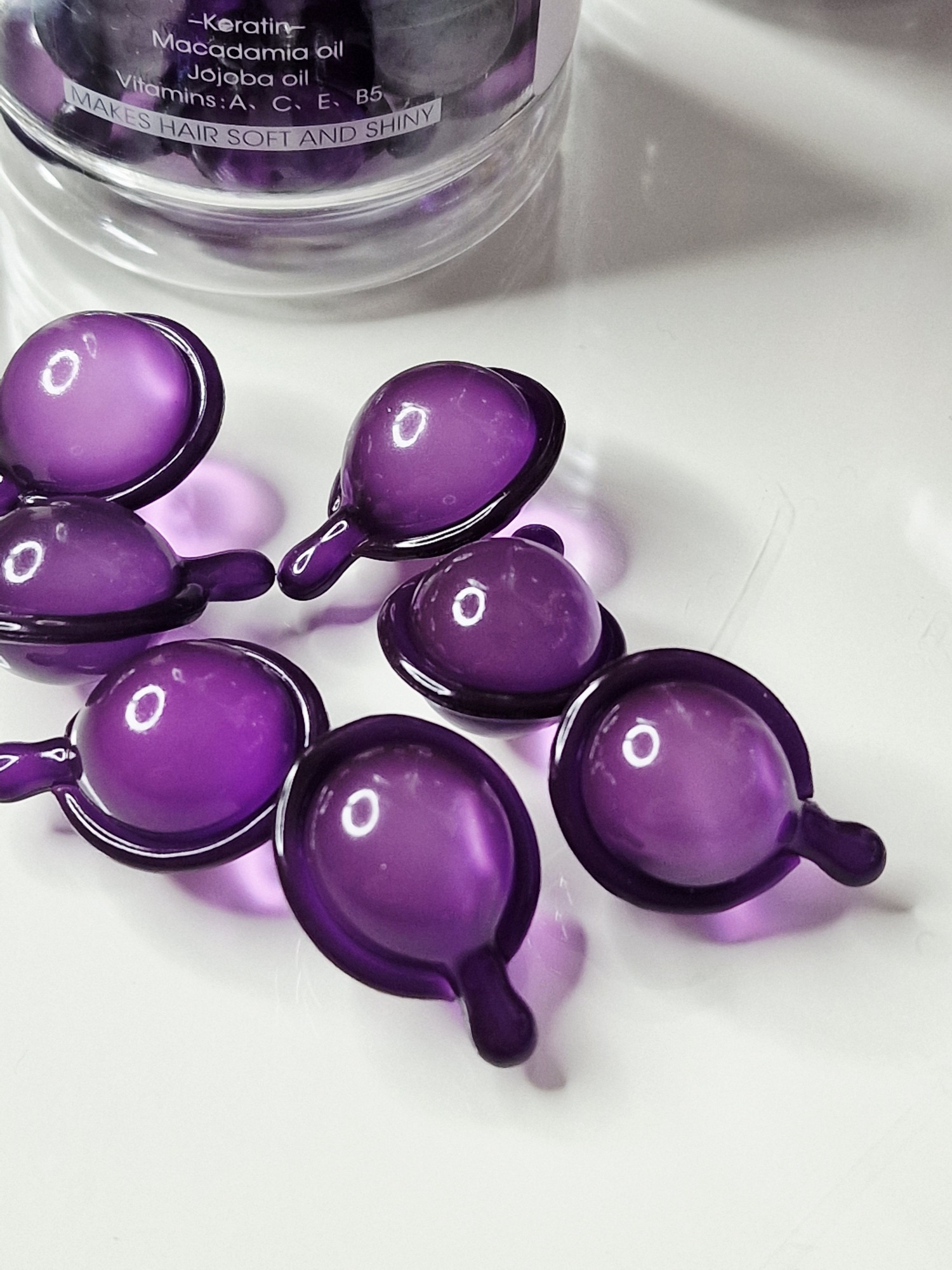 Složení zahrnuje keratin, makadamový olej, jojobový olej a vitamíny A, C, E, B5.