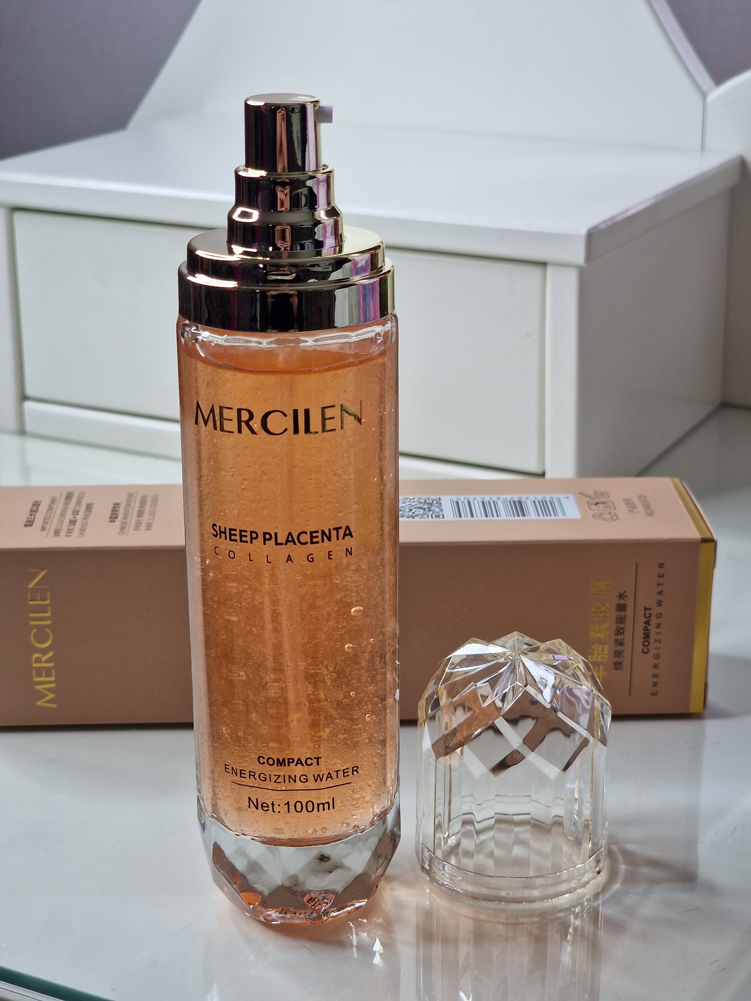 Mercilen Sheep Placenta Collagen Compact Energizing Water, produkt pleťové péče, který funguje jako hydratační esence nebo toner.