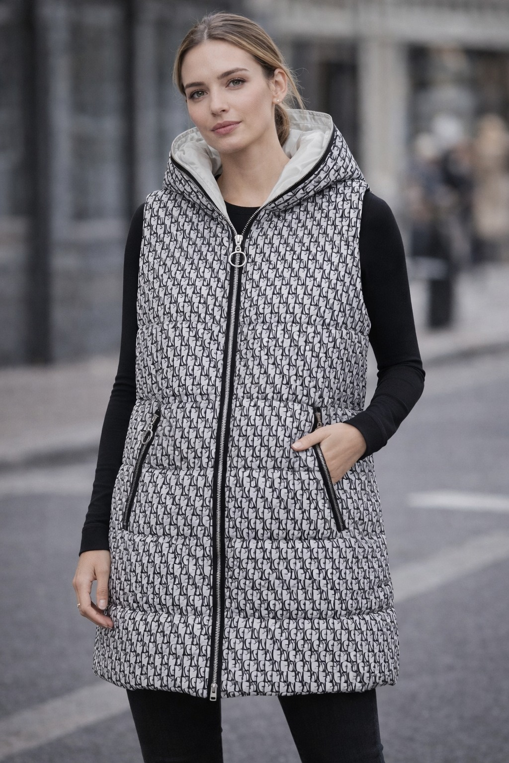 Prošívaná dámská vesta s kapucí New Collection bílá vzor