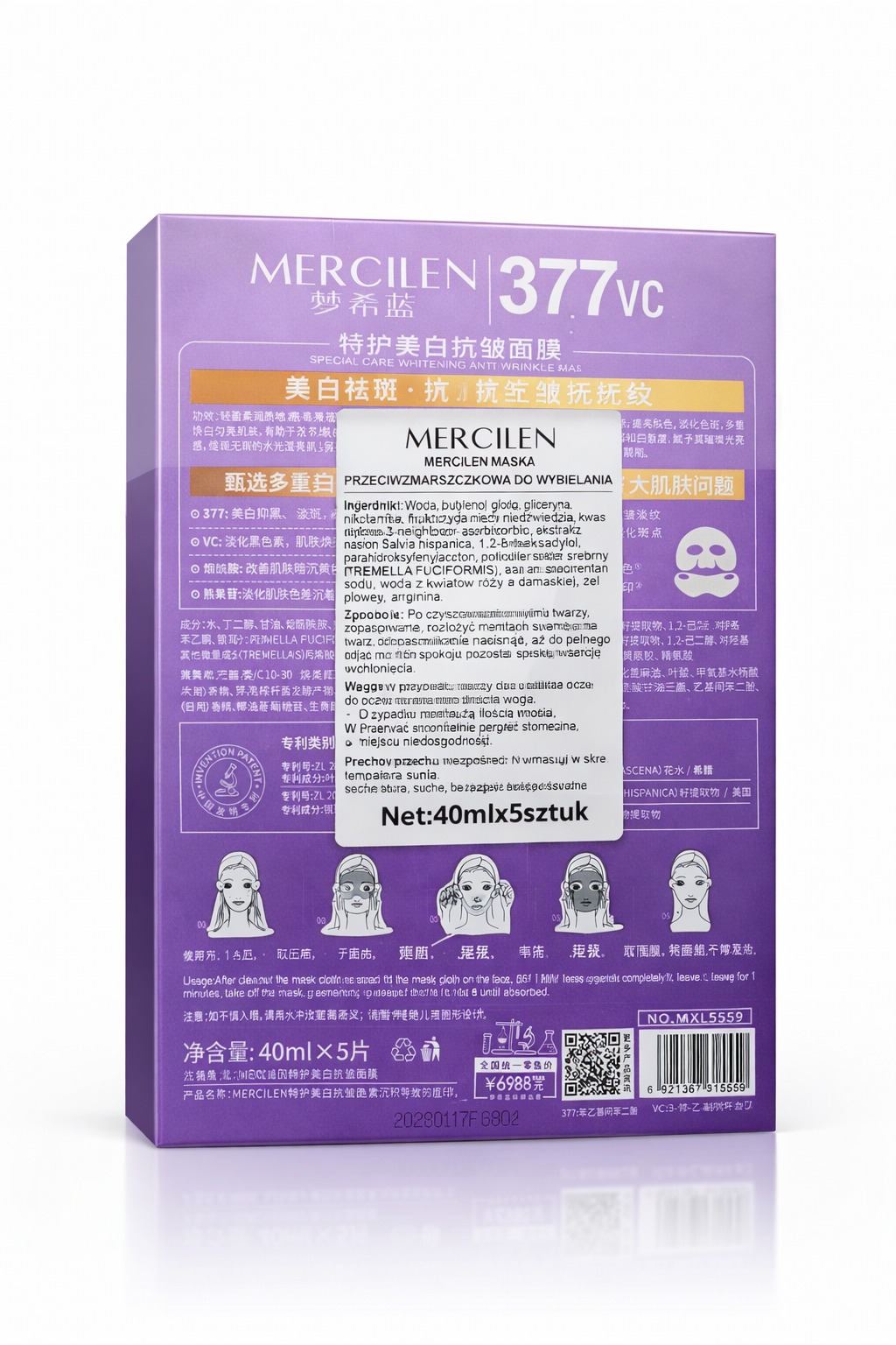 MERCILEN 377vc – Rozjasňující a protivrásková plátýnková maska 40 ml × 5 ks