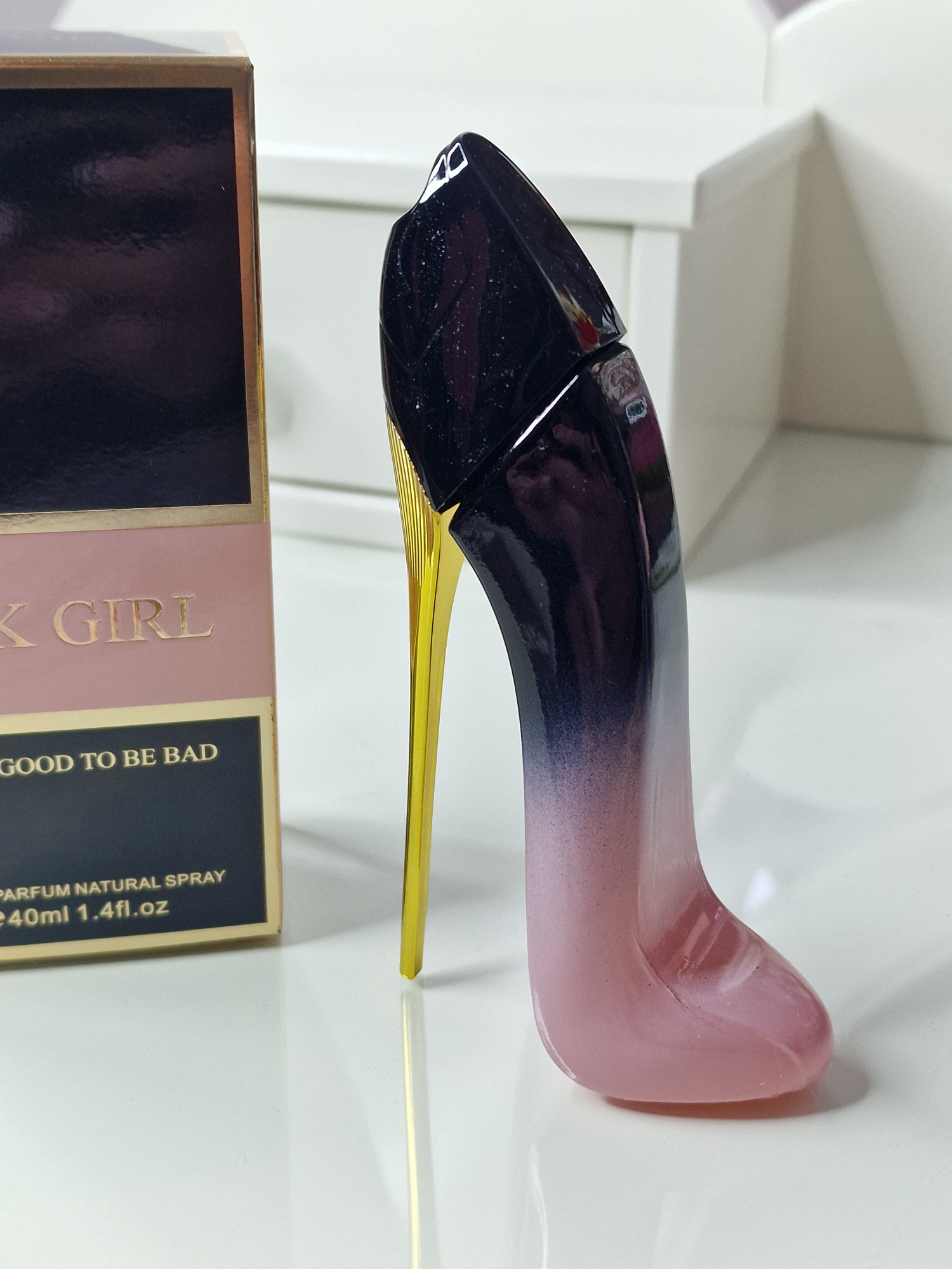 Ikonický flakon ve tvaru lodičky v pastelově růžové se zlatým podpatkem dodává produktu nádech osvěžující elegance.