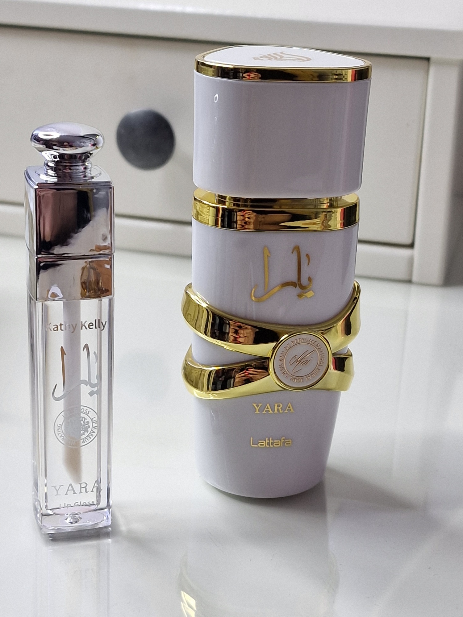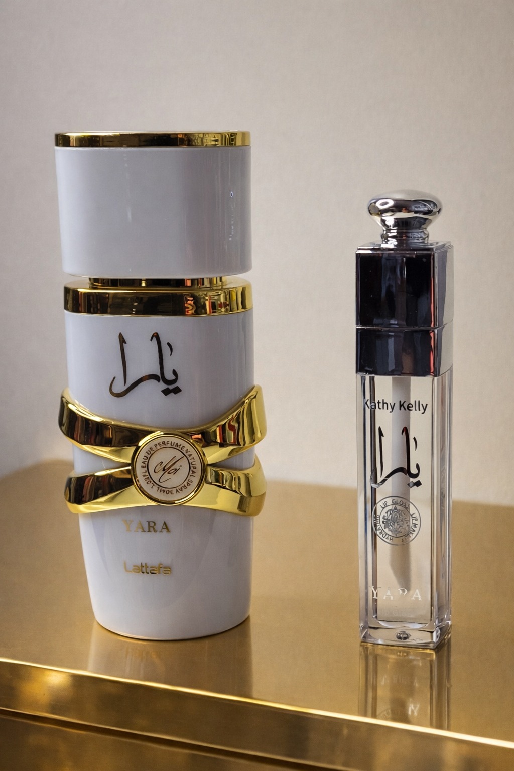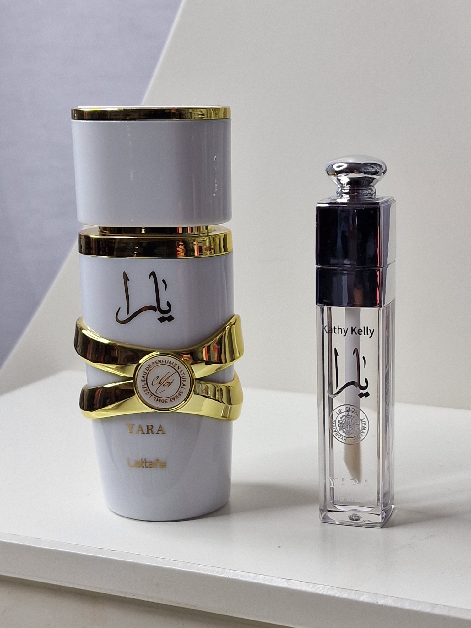 Luxusní dárková sada YARA by Lattafa – Kathy Kelly Edition spojuje ikonickou orientálně-květinovou vůni s jemným leskem na rty.